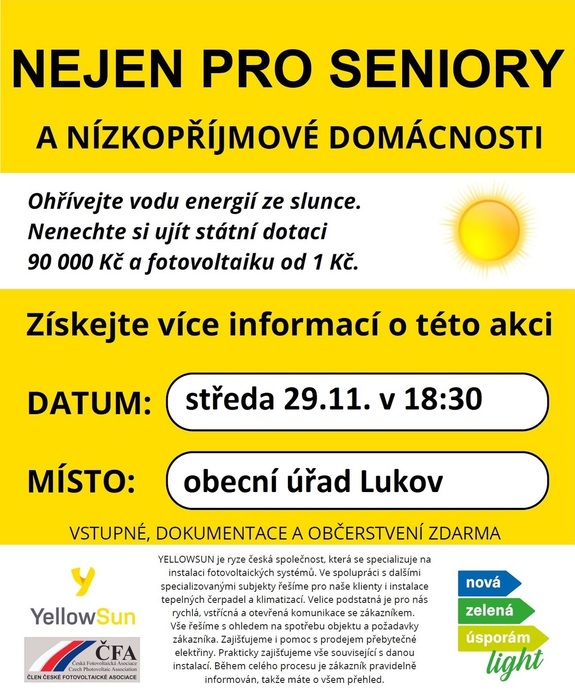 Česká společnost YellowSun pořádá besedu pro seniory a nízkopříjmové domácnosti na téma získání státní dotace ve výši 90 tisíc korun a fotovoltaického systému na ohřev vody.