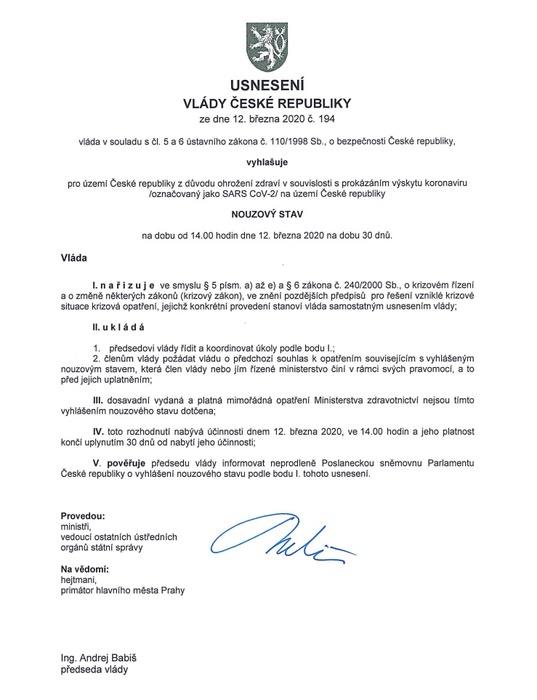 Vláda České republiky vyhlásila 12. března 2020 od 14.00 hod. NOUZOVÝ STAV na 30 dnů, který vyplývá z důvodu epidemiologické situace – nákazy koronavirem.