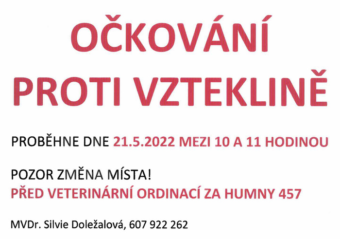 (ul. Za Humny, 457) očkování psů proti vzteklině!